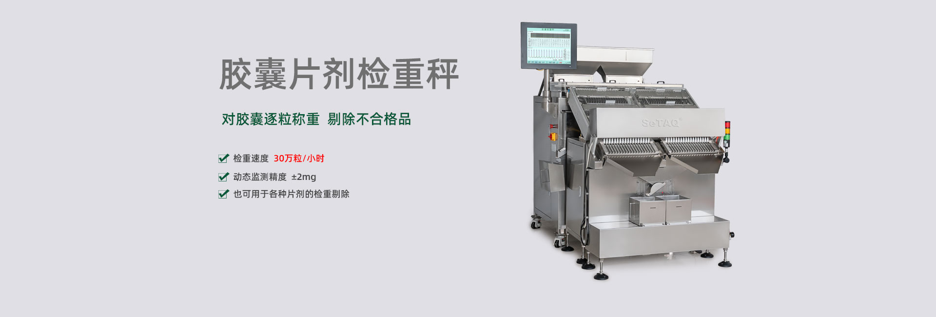 擁有近百項(xiàng)檢重專利和專有技術(shù),開發(fā)的產(chǎn)品可高速、高精度地檢測(cè)膠囊、片劑、丸劑、軟袋、軟管、紙盒、藥瓶、紙箱、薄片及各種器械、零件的重量偏差或缺件